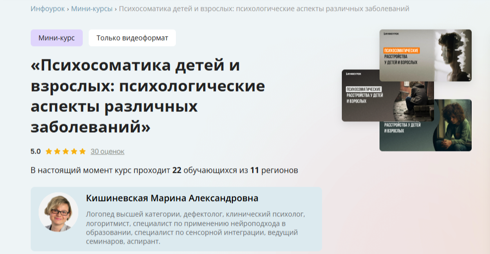 Этот курс рассматривает психосоматические аспекты различных заболеваний, встречающихся как у детей, так и у взрослых, включая болезни органов дыхания, опорно-двигательного аппарата и кожные заболевания.
