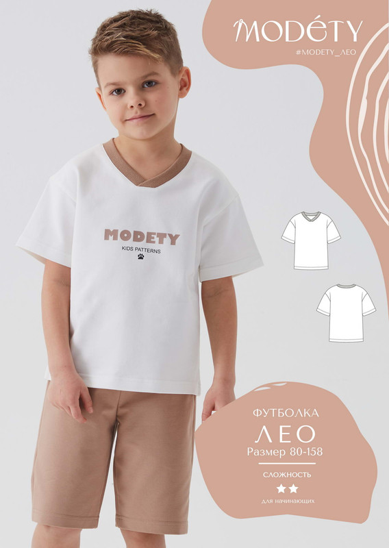 Футболка умеренного объема. V-образный вырез горловины обработан обтачкой. Плечо спущенное. Рукав втачной, длиной выше локтя. Низ изделия и низ рукава обработаны на плоскошовной машине. Длина изделия чуть ниже линии бедер.